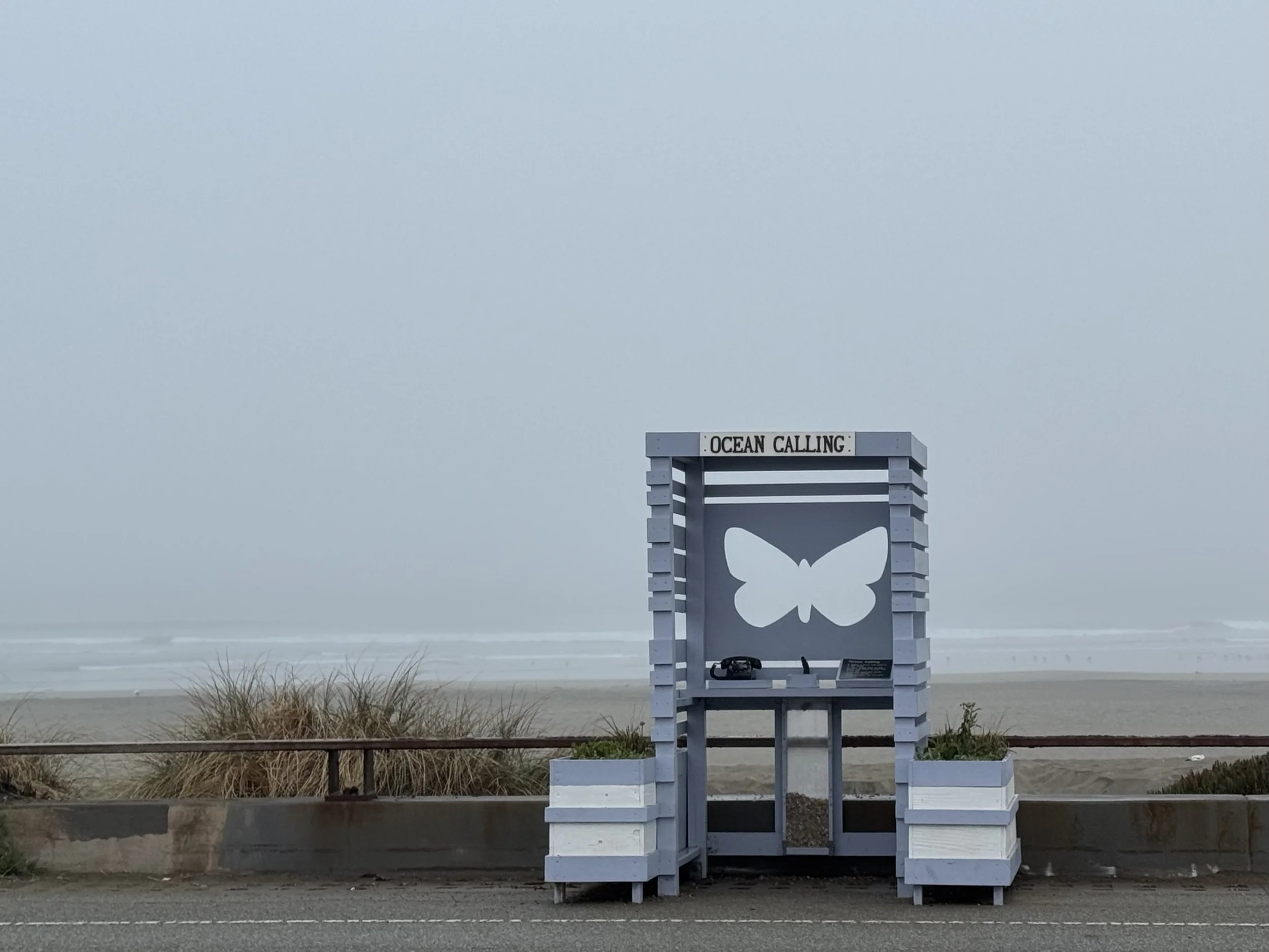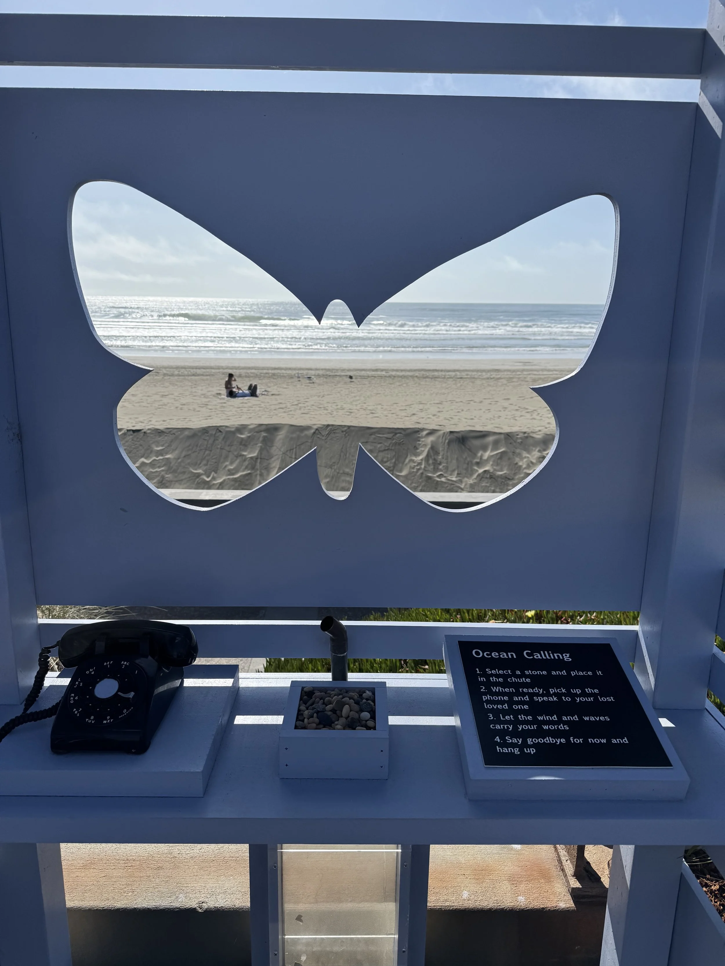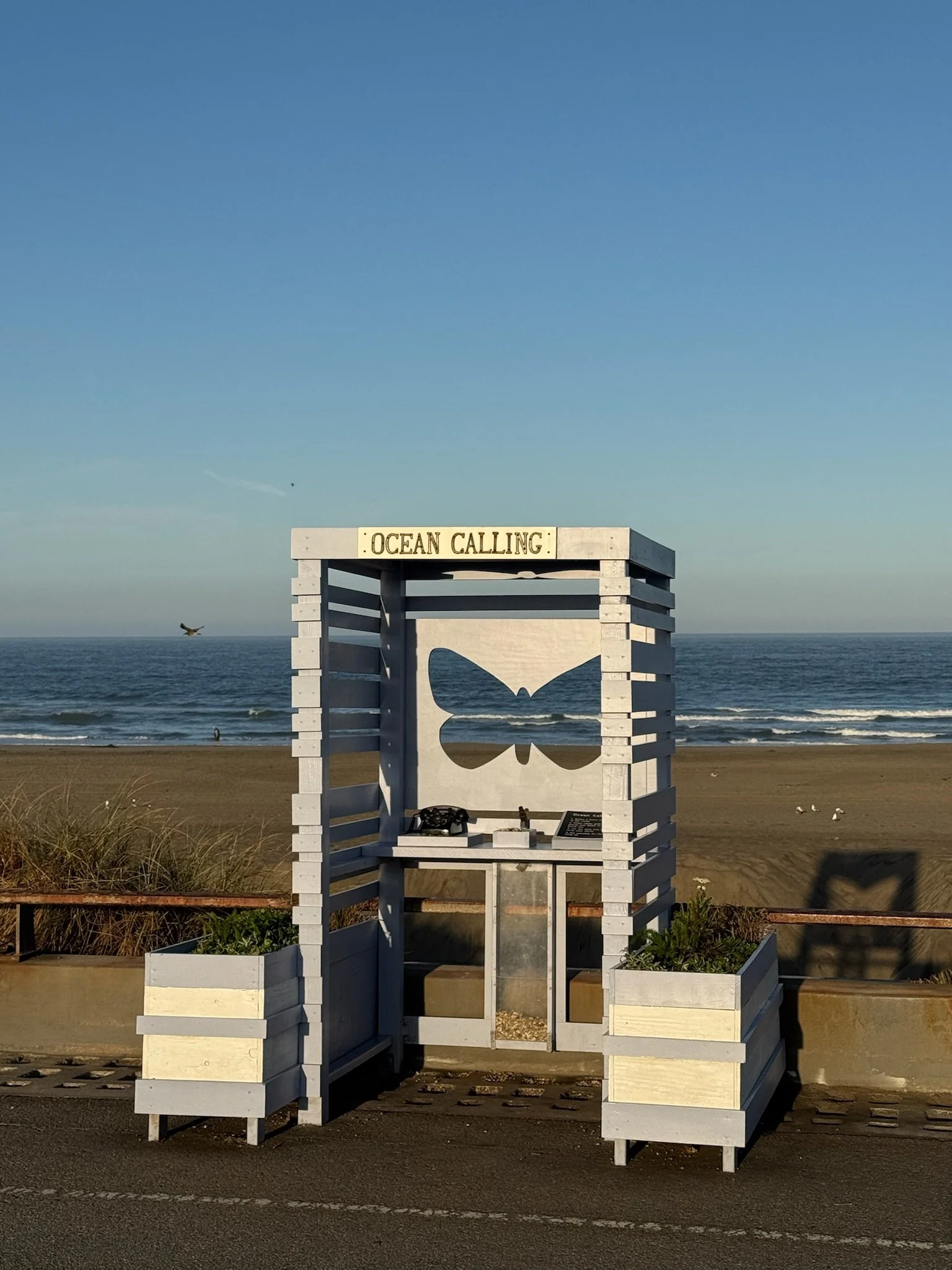 Ocean Calling invites you to speak your words of love, grief and remembrance into the wind and the waves of the Pacific Ocean in the unceded homeland of the Ramaytush Ohlone people, which we now call San Francisco, California. Its specific location is where Ortega Street meets the sea at Sunset Dunes park (formerly the Great Highway). While the phone isn’t connected to a landline, you join an interconnected web of people who have made and received calls. The first threads were spun between Outer Sunset artists Jamae Tasker and Sarah McCarthy Grimm, who were both grieving younger siblings. Jamae’s younger brother died in June 2023 and Sarah’s younger sister disappeared in September 2023.